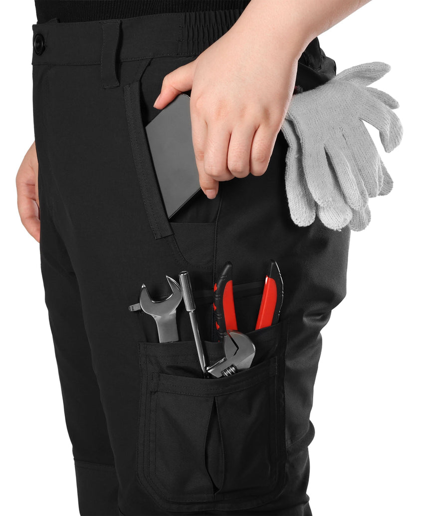 - Engineered knee darts and long knee panels for improved movement. Seven functional pockets, including two hand pockets, a water-resistant battery pocket, patch pockets, and velcro-closure back pockets, allow you to keep your essentials within easy reach.