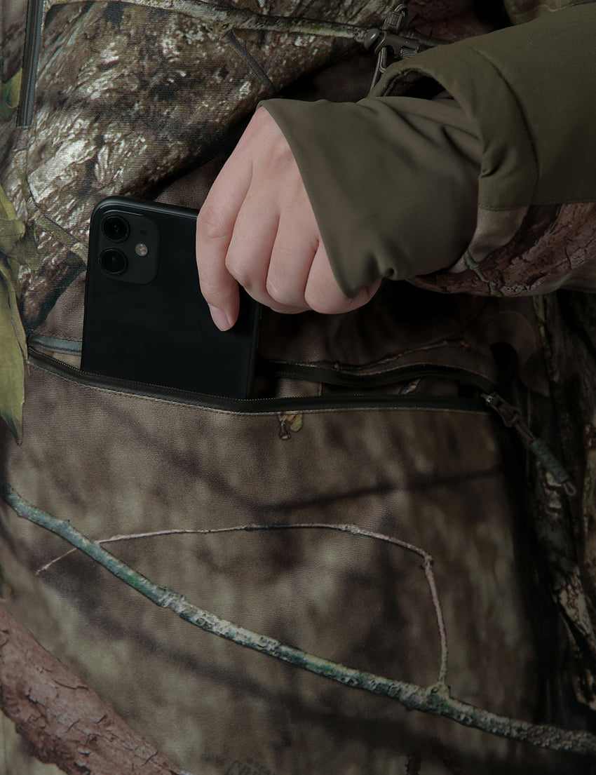This jacket is specifically designed for your next tough hunt with extreme weather condition that’s cold, wet, windy and brush-chocked. Double-layered cuffs with thumbholes keep your hands warm. 5 zipper pockets add extra secure storage for your necessary belongings for hunting.