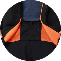 - Ample storage with seven functional pockets, including 2 hand pockets, 2 zippered chest pockets, a battery pocket, a goggle mesh pocket, and a lift pass pocket with an elastic key clip for quick access.