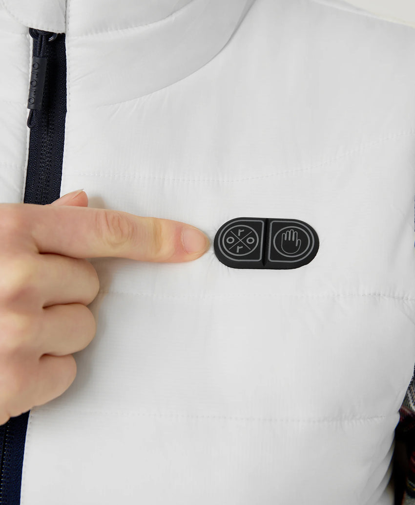 The vest features dual-control power buttons. These allow you to independently adjust the heating level for different zones according to your preference. "ororo LOGO" Button: Controls the upper body heating zones, which include left & right shoulder, neck, and mid-back. "hand" Button: Controls the hand pockets heating zones.
