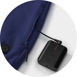 - The external battery storage by the left seam and discreet power button by the left hem make adjusting heating levels easy and convenient.