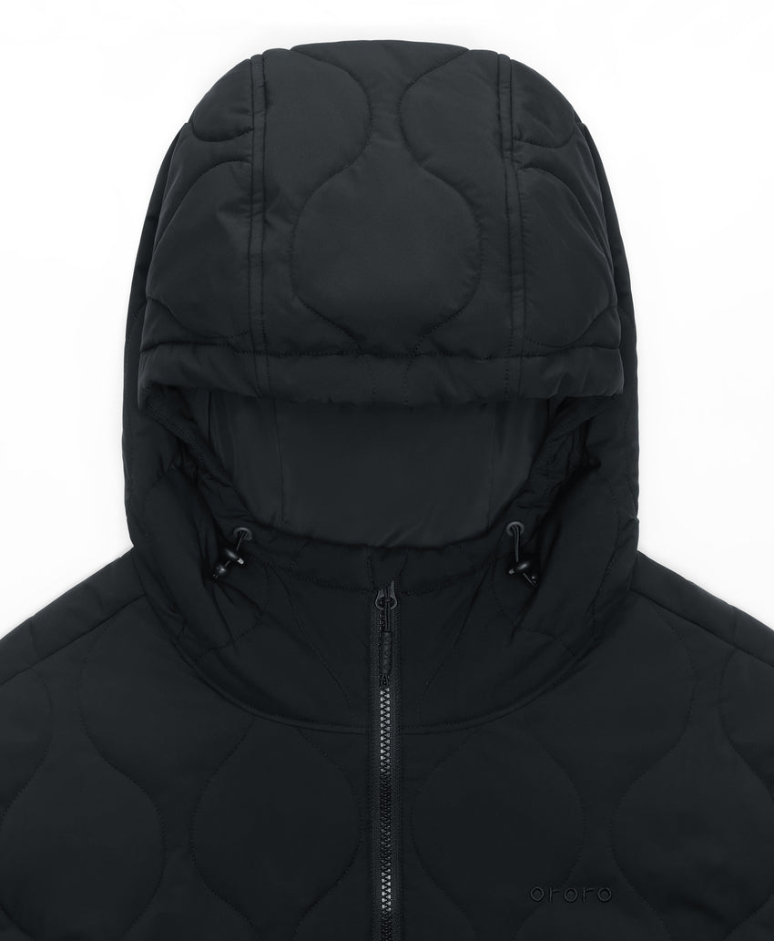 The Stargazer quilted hoodie is a versatile, lightweight jacket from new Pathfinder Collection, perfect for on-the-go in all seasons. Ideal for commuting or outdoor activities, it offers reliable warmth with 4 strategically placed heating zones. The stylish onion pattern design and insulation provide both warmth and a modern look. The discreet power button near the hem allows easy control of the heating level, while water-resistant and wind-resistant fabric protects you from the elements.