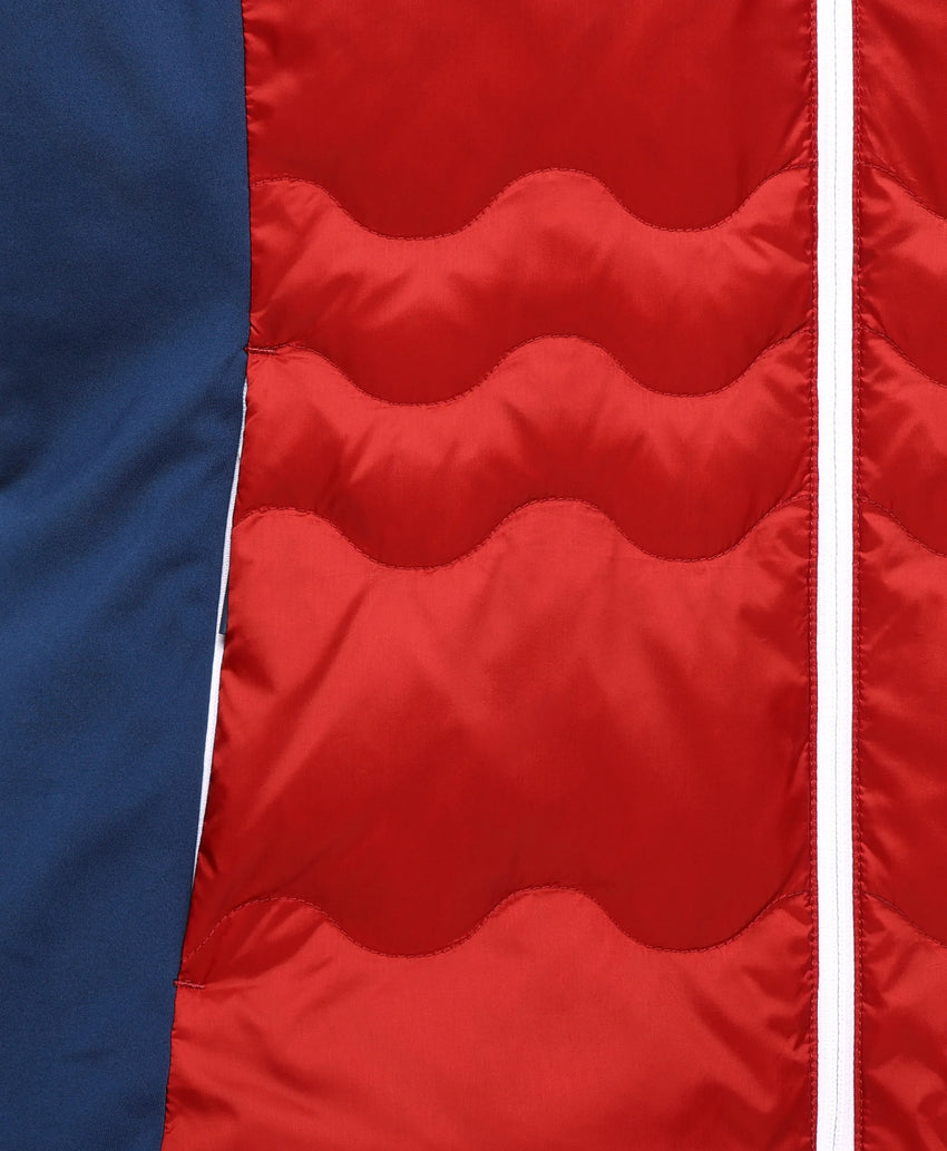 Featherlight down insulation holds warmth while the stretch panels maintain range of motion for active wear.